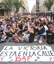 Unos 200 jóvenes se manifestaron esta tarde en el centro de Barcelona por el apuñalamiento de un menor el sábado en el Metro de Barcelona por parte de una decena de jóvenes de estética 'skin-head'. El joven agredido iba acompañado de su novia, de origen sudamericano, que pudo haber sido el primer objetivo de los 'skins'.