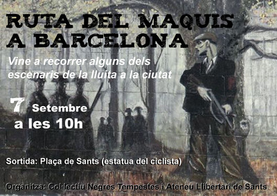 | Per segon any consecutiu, el proper diumenge 7 de setembre a les 10 del matí a la plaça de Sants començarà la ruta de dels maquis a Barcelona. Aquesta activitat es fa dins de l'edició d'enguany de la Marxa d'Homenatge als Maquis.