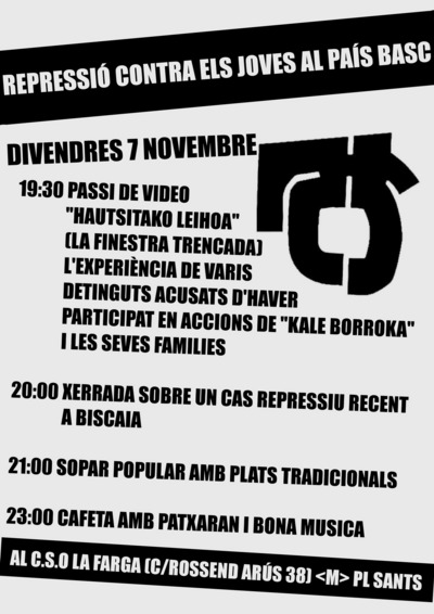 Perquè considerem indispensable evidenciar el caràcter repressiu de l’Estat i conèixer altres realitats de lluita, aquest divendres dia 7 de novembre organitzem al CSO La Farga una petita jornada de reflexió sobre la repressió al País Basc, que tindrà com a eix principal la projecció d’un documental sobre les vivències de varis detinguts per “kale borroka” i lles seves famílies: