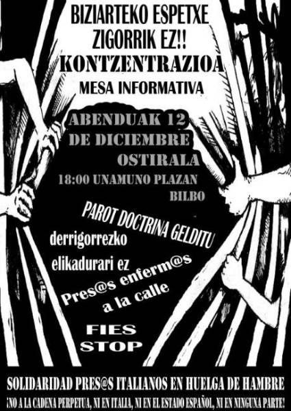 Este viernes 12 de diciembre a partir de las 18:00 en la plaza Unamuno de Bilbo, hemos convocado una concentración en solidaridad con la huelga de hambre que desde el 1 de diciembre están iniciando multitud de pres@s en Italia y en diferentes estados de Europa, entre ellos el español. Su objetivo es el de denunciar la la muerte en vida que varios centenares de reclus@s están padeciendo en las prisiones italianas.