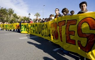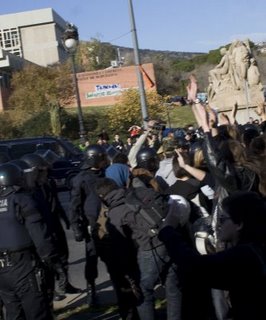 Asimismo, estudiantes de la UB han cortado la diagonal a la altura del campus de la UB, y otro grupo de estudiantes han cortado la gran vía, a la altura del rectorado ocupado. Según han informado a La Haine unas 100 personas han cortado la gran vía, impidiendo el paso de ningún vehículo. Han estado allí una hora, y al ver que ya no pasaban coches y que la policía había ordenado el tráfico, han salido en manifestación hacia la sede del comisionado de universidades. Ahora mismo están por las ramblas, y están gritando consignas contra Bolonia y exigiendo la readmisión de lxs alumnxs expulsadxs. En la cabecera llevan una pancarta que pone: "6 companys expulsats. Ni 1000 expulsions aturaran el no a Bolonia. Si volen guerra, la tindran".