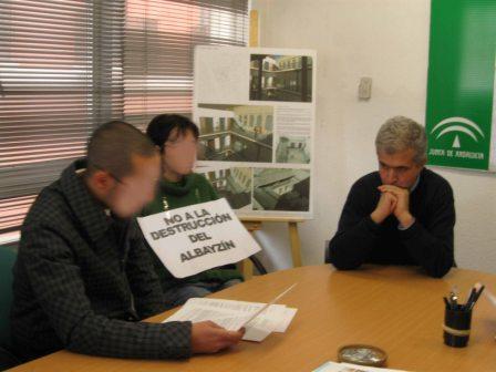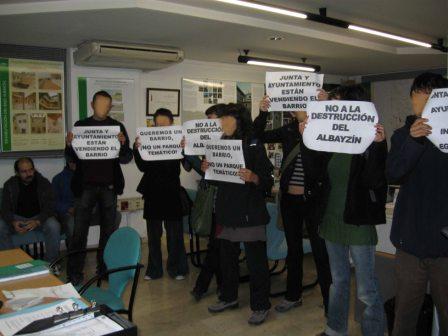 Dentro de la Oficina de Rehabilitación hay un grupo de personas que llevan a cabo un acto simbólico de denuncia, con la intención de que se mande un fax a la Oficina Central de la Junta, en Sevilla, al Ayuntamiento de Granada y a la Unesco. En el fax se expresa la disconformidad de todas estas personas con las políticas que se están llevando a cabo en este barrio, remarcando la colaboración directa, a través de sus diferentes actuaciones, con intereses especulativos, así como sus trágicas consecuencias para los vecinos.