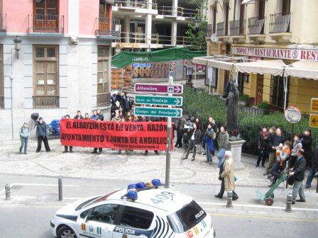 Un grupo de vecinos y amigos del Albayzín nos encontramos esta mañana aquí para protestar de forma pública por el papel que está cumpliendo la Junta de Andalucía y el Ayuntamiento de Granada en la destrucción del barrio Albayzín y la expulsión de las personas que han vivido en él durante décadas.