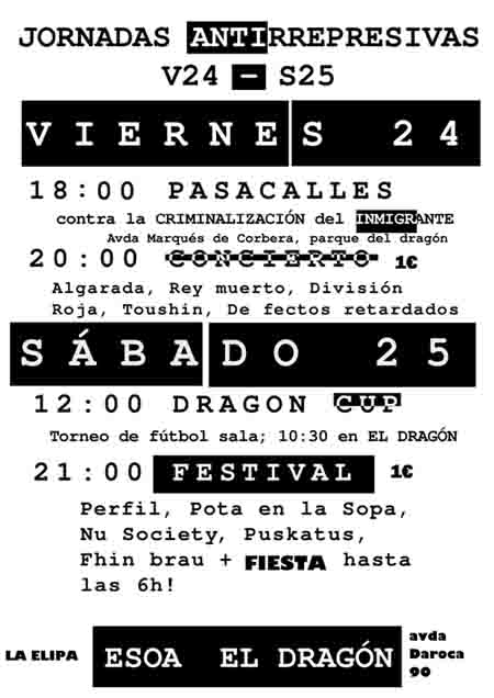 18:00 PASACALLES contra la criminalización del inmigrante. Desde el parque de El Dragón (Avenida Marqués de Corbera 1, Metro La Elipa, buses 15,28,110,210) hasta el E.S.O.A. El Dragón.