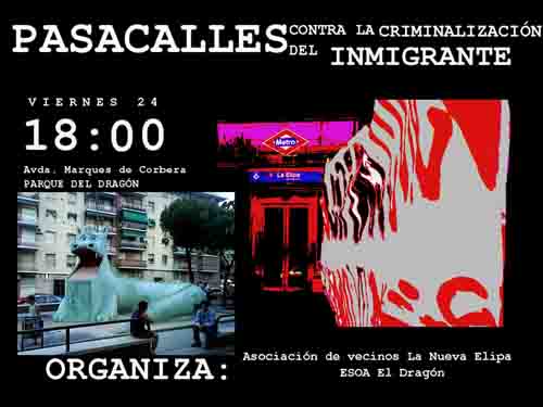 Desde el E.S.O.A. El dragón convocamos a tod@s l@s vecin@s, a la juventud del barrio, a toda la población inmigrante a participar en el PASACALLES que organizamos en colaboración con la Asociación de Vecinos Nueva Elipa este viernes 24 de Abril a las 18:00 desde el parque de El Dragón (Avenida Marqués de Corbera 1, Metro La Elipa, buses 15,28,110,210) hasta el E.S.O.A. El Dragón. Será un pasacalles festivo a la vez que combativo, un pasacalles en el que denunciaremos la persecución de las personas en base a su lugar de procedencia, un pasacalles en el que exigiremos papeles para tod@s, en el que denunciaremos la criminal y racista ley de extranjería.