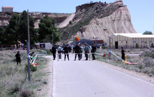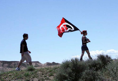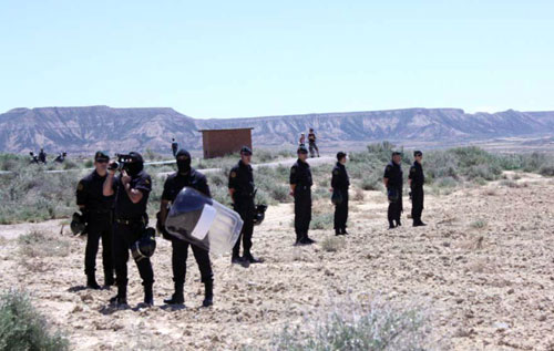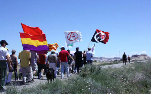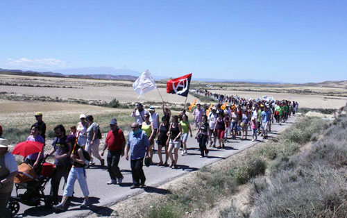 A las 12:00 comenzó la marcha antipolígono en las Bárdenas, transcurrió con calma aunque hubo momentos de tensión cuando un protector del orden y la ley intentó quitar la cámara de fotos a una chica que había estado haciendo fotos a los militares, en el perímetro de seguridad, rodeados por militares, y guardias civiles, algunos de ellos encapuchados. Los manifestantes también fueron grabados con una vídeo-cámara.