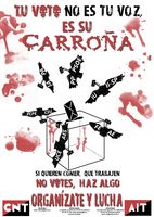 Por último decir que, como dijo un compañero, “nuestro voto es el voto más grande, el más importante, pues el más meditado, es el voto a la responsabilidad, al compromiso diario con la lucha”. Para terminar debemos dejar claro que el electoralismo no es democrático sino una dictadura en toda regla ya que, como va a pasar, el abstencionismo se situará alrededor del 50%, por lo que la mitad de l@s llamad@s a votar van a decidir a los mandamases que dirigirán nuestras vidas. Desde la Confederación Nacional del Trabajo siempre se hace incapié en que la abstención no es la solución si no va acompañada de la autorganización y la lucha, la solución es, en pocas palabras, la abstención activa.