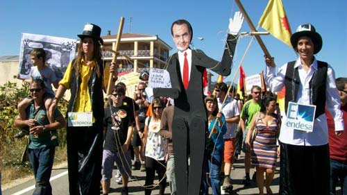 Durante todo el recorrido, dos zancudas -caracterizadas como Ibertrola y Endesa- manejaban a su antojo una marioneta un Zapatero, que ilustraba el sometimiento del PSOE a las exigencias de las grandes empresas eléctricas. Después de tanto baile y desenfreno inducido por la Orkresta Nacional, la marioneta de ZP se quedó coja, ante los gritos de júbilo de algunos manifestantes.