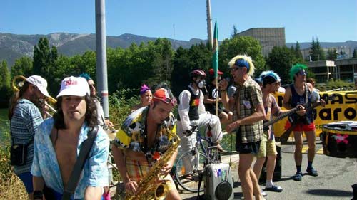 A las 12:30 de la mañana, bajo un enérgico y energético sol, comenzó desde Barcina del Barco la manifestación antinuclear. Un helicóptero de tulipán que volaba a poca altura incordiaba constantemente a las manifestantes, que al no disponer de cohetes pirotécnicos no pudieron evitar el acoso aéreo. La manifestación recorrió las calles de Barcina del Barco, pueblo del Valle de Tobalina colindante con Garoña, para posteriormente encararse hacia la central nuclear. La Orkresta Nacional (antes Elektrotuna) amenizaba incombustiblemente a los manifestantes con su repertorio de versiones. Sobre los asistentes destacaban las banderas antinucleares, junto a otras banderas de colectivos políticos y sindicatos que apoyaban la movilización.