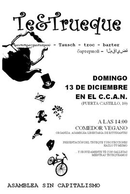 El comedor vegano empezara sobre las 14:00 y habra una representacion de trueque y proyecciones de la filosofia hazlo tu mismx. Y luego empezara el trueque, y para animar habrá un rico té acompañado de galletas.
