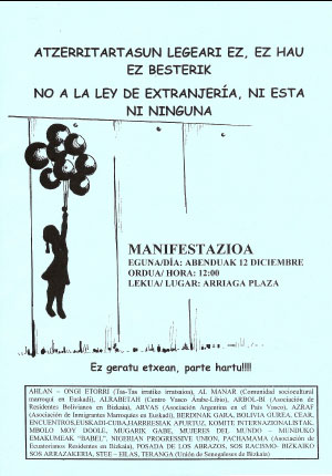"No a la ley de extranjería. Ni esta ni ninguna". Es el lema de la manifestación que un total de 23 colectivos de inmigrantes y movimientos sociales han convocado, con motivo de la reciente aprobación de la reforma de la Ley de Extranjería en el estado español. La protesta partirá este próximo sábado día 12 a las 12 del mediodía de la Plaza Arriaga.