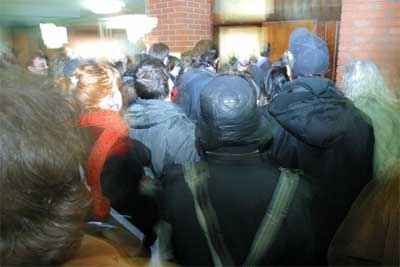 La multitud abarrota la sala y presiona a los agentes para poder entrar