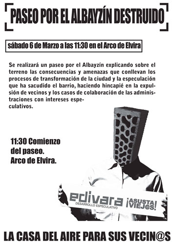 Con este paseo se quiere mostrar los efectos producidos por la especulación inmobiliaria en el Albayzín, haciendo especial incidencia en los vecinos/as mayores expulsados de sus casas a través de diferentes artimañas como la declaración de ruina de edificios que no lo están, la falta de mantenimiento por los propietarios, etc. todo ello para trasformar las antiguas casas de vecinos/as en apartamentos, hoteles, etc. orientados a personas de mayor renta.