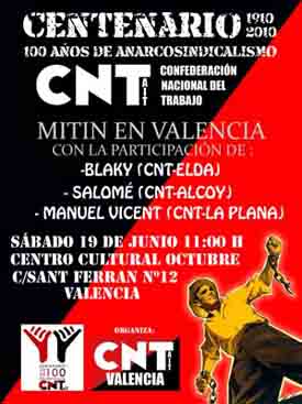 El Sindicato de Oficios Varios de CNT-Valencia ha organizado la celebración de un Mítin en la ciudad de Valencia. Este acto se encuentra enmarcado dentro de las diferentes actividades, charlas, proyecciones y debates que se están produciendo en muchas partes del estado español en conmemoración del CeNTenario de la Confederación Nacional del Trabajo, 100 años de anarcosindicalismo.